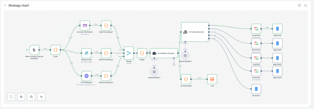 The most important role of workflow is to serve as a key bridge connecting AI technology and quantitative trading. It transforms AI from an independent analytical tool into a core component that can directly participate in trading decisions and execution. Through workflow, users can link the analytical capabilities of large language models, market data acquisition, technical indicator calculations, and trade execution to form a complete intelligent trading chain.