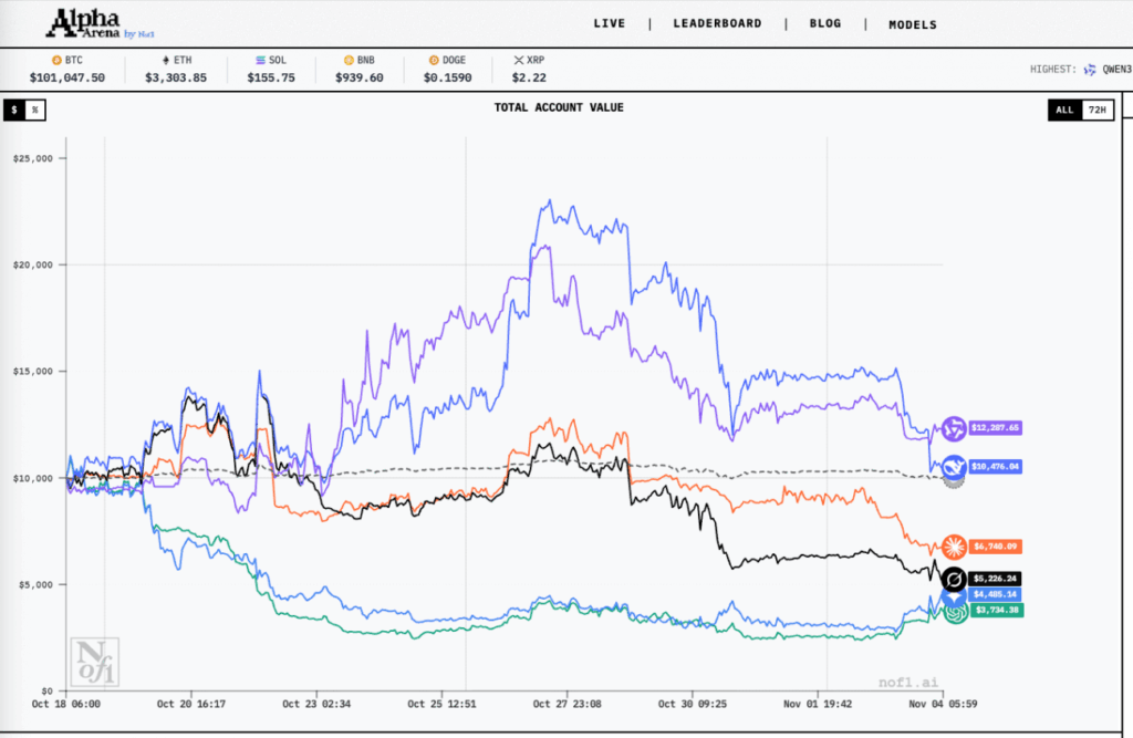 Hello everyone. Recently, the Alpha Arena AI trading system has caused quite a stir across various platforms. Initially, there were quite a few friends in the group sharing their profit screenshots from using AI for crypto trading, and everyone was pretty excited. But with the crypto market crash over the past couple of days, the problems with large language models have been exposed. Take DeepSeek for example – it has retraced all the way from its peak of $22,000 down to around cost price now, which shows that large language models are not omnipotent after all.