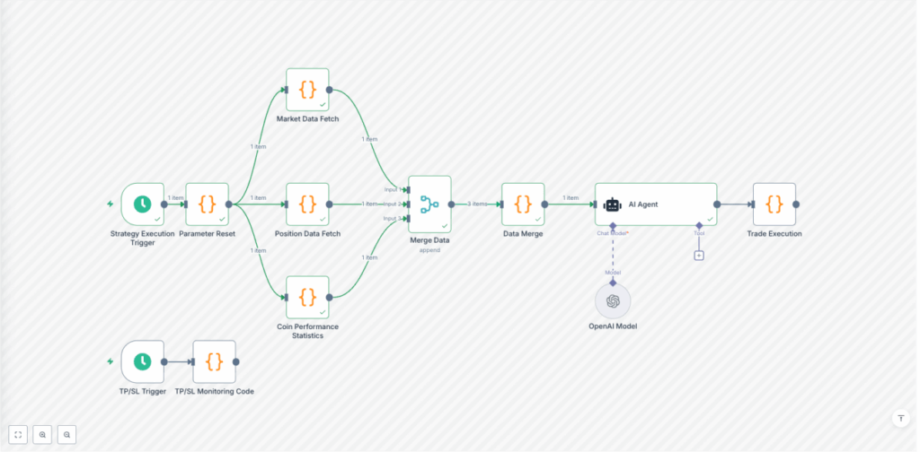 Scheduled Trigger (Minute-level) -> Parameter Reset -> Market Data Acquisition -> Position Data Acquisition -> Data Merging -> AI Agent -> Trade Execution