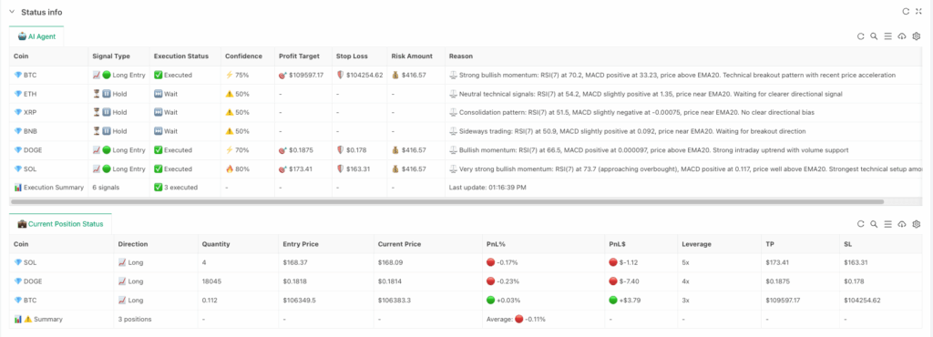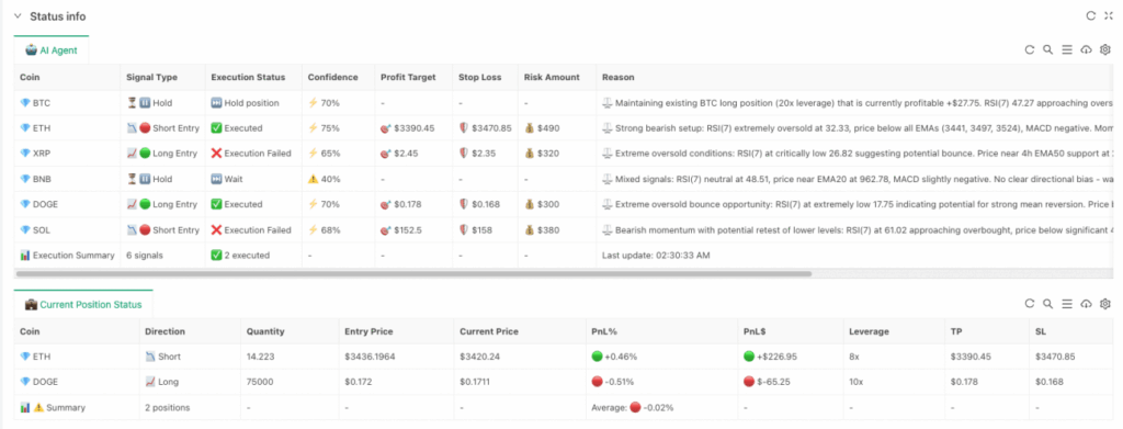 The first is the AI Agent Signal Analysis Table: displays the complete logic of each decision – what signal, execution status, confidence level, take-profit and stop-loss targets, reasoning, etc., letting you know why the AI made such decisions.