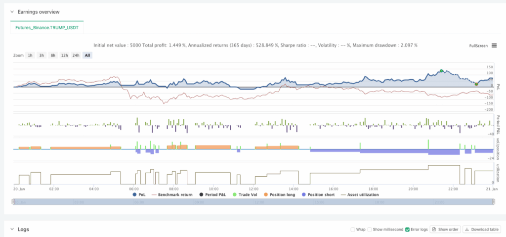 Analysis of TRUMP_USDT Binance futures listing day backtest (January 20, 2025 to January 21, 2025):
