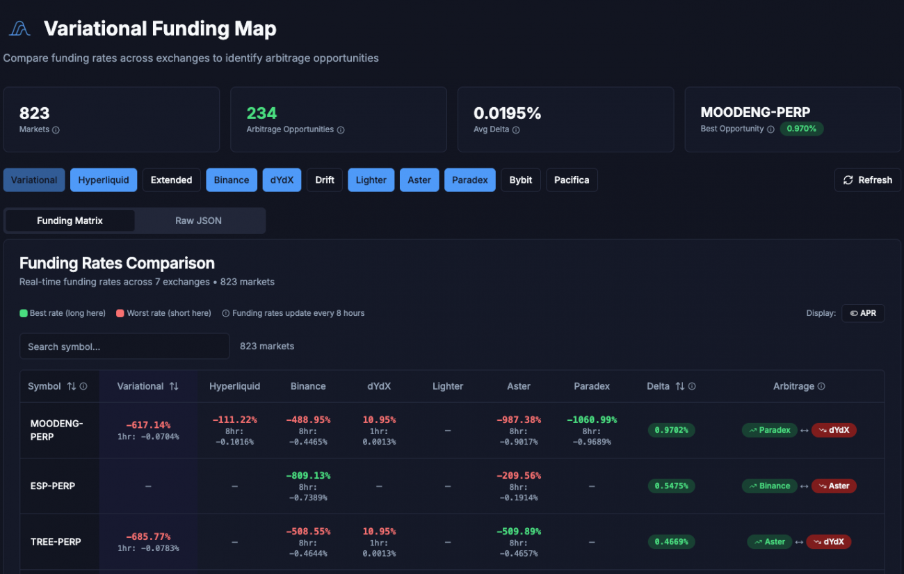 Fortunately, someone recommended the VarFunding platform. This platform collects real-time funding rate data from multiple exchanges, including Binance, Hyperliquid, Lighter, Bybit, and more — all of which are already supported on the FMZ Quant platform. More importantly, it compares funding rate data in real time and provides optimal arbitrage opportunity combinations.